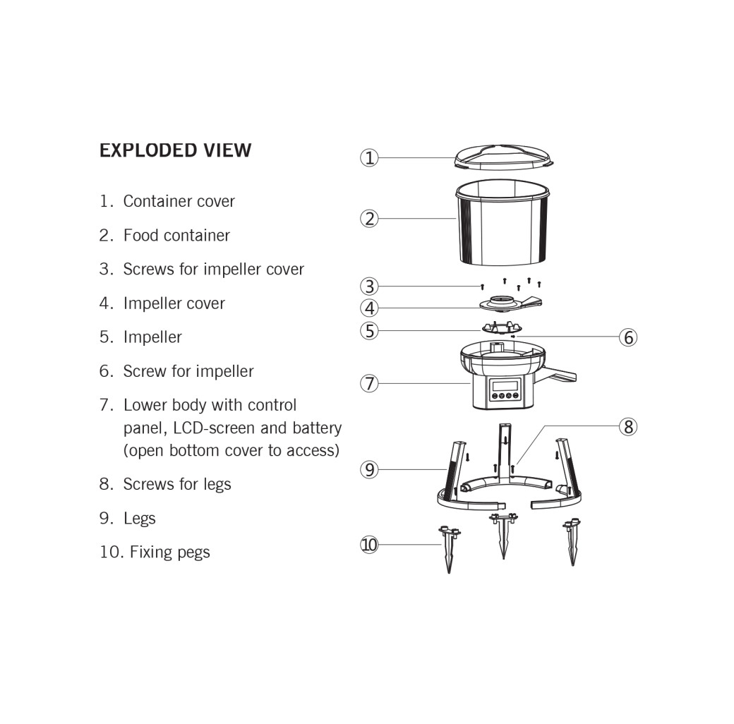 evoFeed Automatic is specially designed with a strong motor and extra bottom ventilation over the impeller to prevent the food from clogging. Fixing pegs are included, which makes it easy to place and secure the feeder at the edge of your pond.