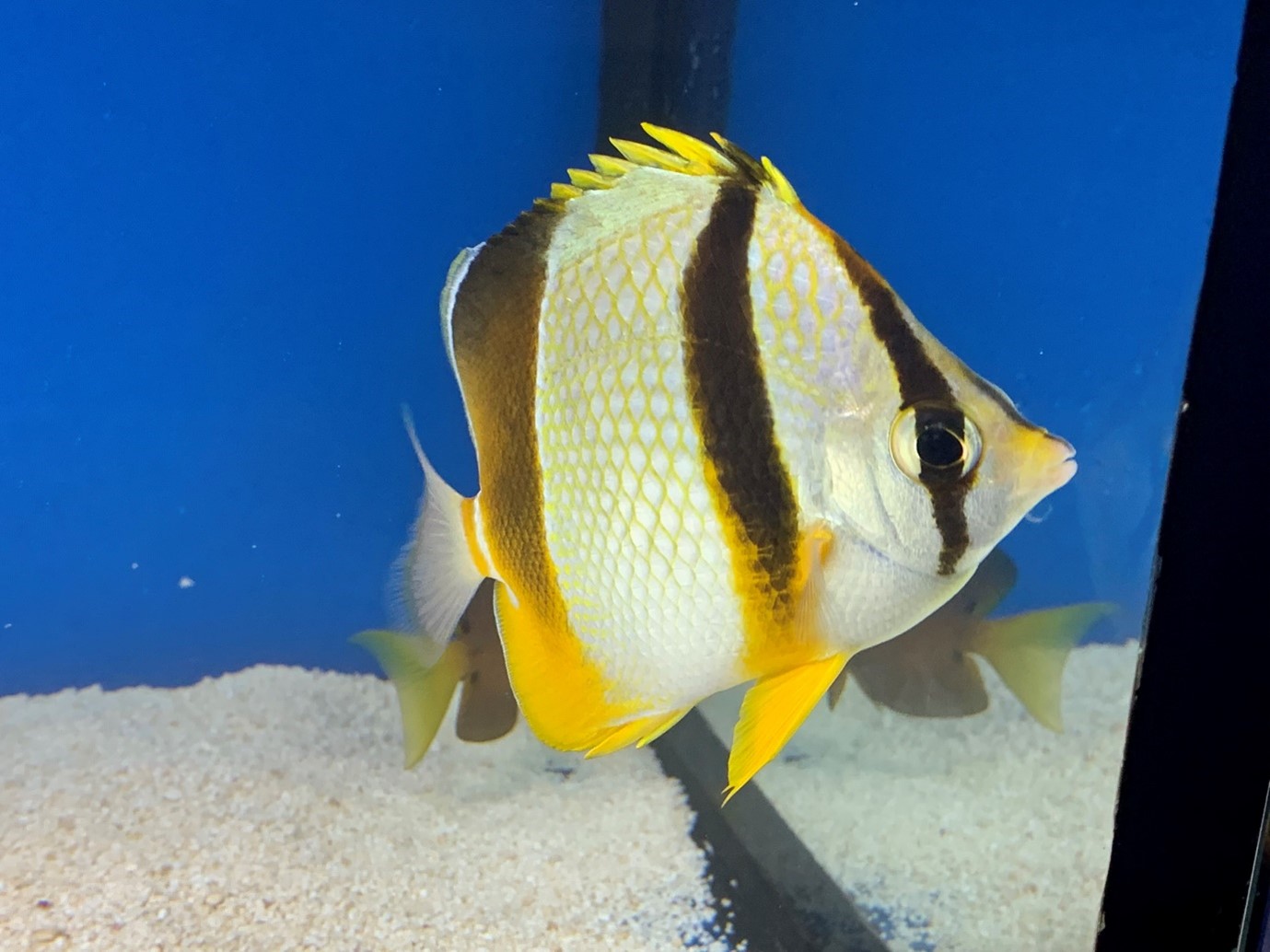 An unusual sight in home aquaria thanks to its restricted home range, the Three-banded butterflyfish (Chaetodon robustus) makes a sturdy aquarium resident with looks reminiscent of the more delicate Copperband (Chelmon rostratus). Like many generalised feeders, they may find corals a temptation but will thrive in fish-only systems when offered a wide range of foods based on a quality dried diet. This chunky specimen was a highlight of a visit to our Reefkeeper Rugby store.